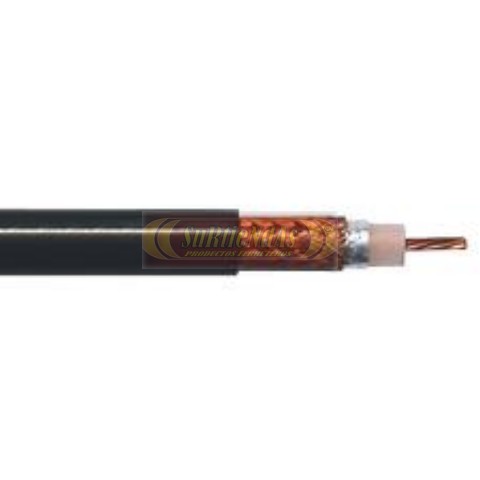 Conductor solido de cobre duro, aislamiento de polietileno espumado, blindaje de cinta y malla trenzada de aluminio, cubierta exterior de policloruro de vinilo (PVC) color negro. Dimensiones estandarizadas que permiten el uso de conectores comerciales. Bajo nivel de perdidas de transmision. Resistencia a la intemperie. El blindaje metalico le proporciona proteccion contra interferencias electromagneticas. Facilita la instalacion por su flexibilidad y bajo peso. Principales aplicaciones: Generalmente se emplea donde se requiera transmitir señales electricas con bajas perdidas y proteccion contra interferencias electromagneticas.