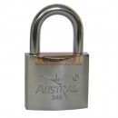 Cuerpo de metal fundido en acabado cromo brillante. Cilindro de latón sólido y doble cerrojo. Con 3 llaves niqueladas. Gancho corto de acero endurecido y niquelado