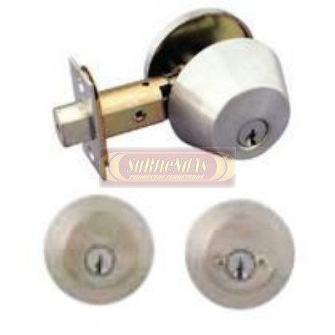 Cerrojo de seguridad adicional, cilindro 5 pernos, pestillo antisegueta con 1" de penetración y alma de acero giratoria. Función: Llave-llave, llave en el exterior/llave en el interior.